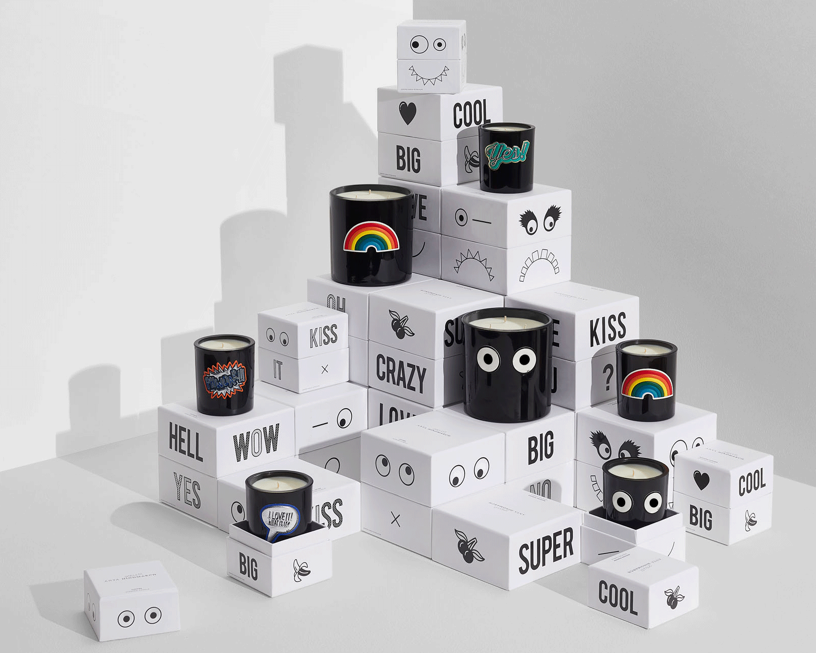 Art Direction for Anya Smells a collection of candles and an innovative ceramic diffusers that are inspired by ‘everyday’ scents. The visual identity uses graphics that I had previously created for Anya Hindmarch Sticker Shop collection. The expressive puzzle-like, sculptural boxes, allow different combinations of faces and word-play by it’s users.
